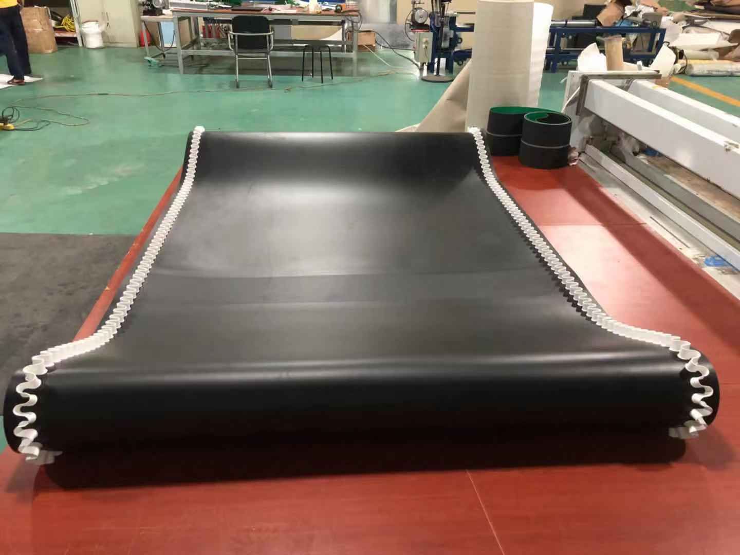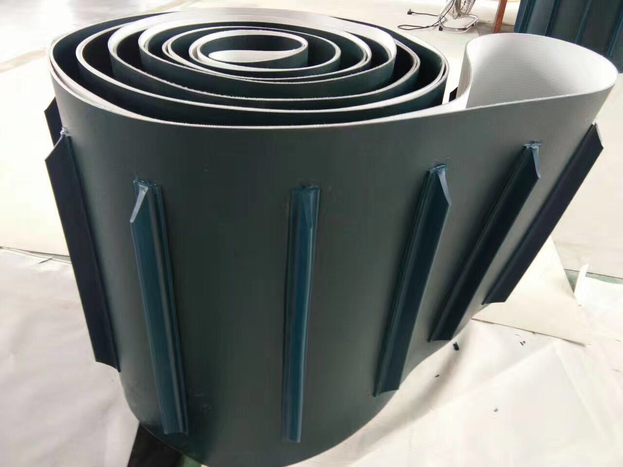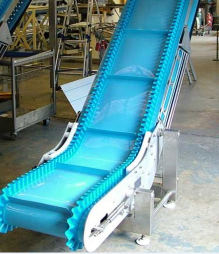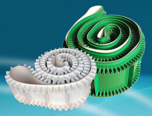輸送帶(裙邊擋板帶),擋邊起防止物料測滑撒落的作用。為便于轉(zhuǎn)彎,裙邊設(shè)計成波紋狀;橫隔板的作用是承托物料,為了實現(xiàn)大傾角輸送,采用T型TC型。檔邊和橫隔板是用二次硫化的方法與基帶連接的,具有很高的連接強(qiáng)度。用于輸送易散落的粉狀、粒狀、小塊狀、糊狀及液態(tài)狀物料。